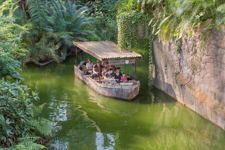 Leipzig, Germany - 25 April 2019: Amusement park. People in boat floating on the river in the tropics. Attraction Landscape