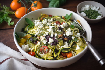 zucchini noodle bowl with roasted vegetables, herbs and cheese, created with generative ai