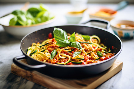 zucchini noodles with vegan tomato sauce and basil in a pan