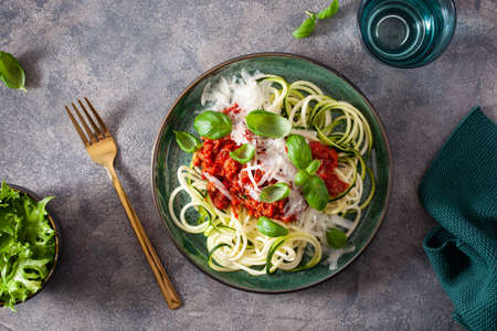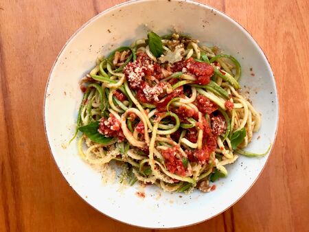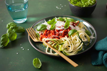 keto paleo zoodles bolognese: zucchini noodles with meat sauce and parmesan