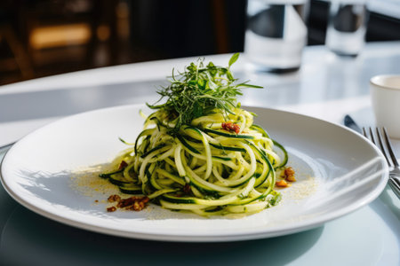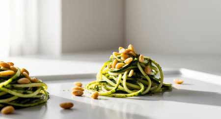 AI Generated. Vegan pesto zucchini noodles with pine nuts closeup