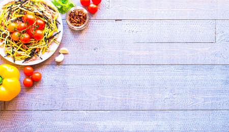 Pasta background with vegetables and herbs on a wooden table. Free space for text. Top view
