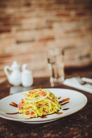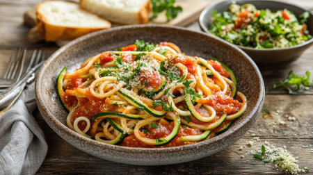 Spaghetti with zucchini and tomato sauce on a wooden table