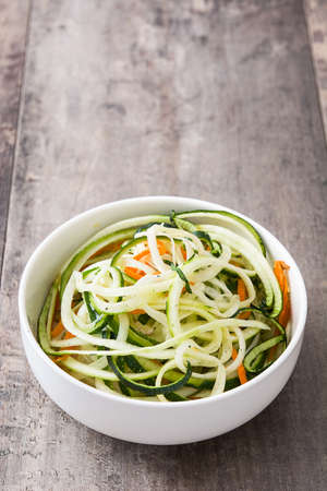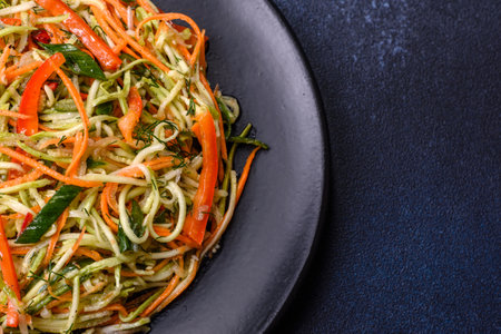 Fresh salad of sliced thin strips of carrot and zucchini on a concrete background. Vegetarian food