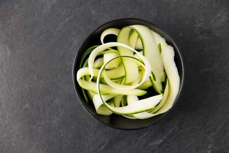 vegetable, food and culinary concept - close up of peeled or sliced zucchini in ceramic bowl on slate stone background