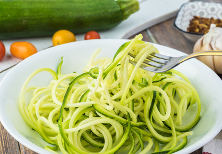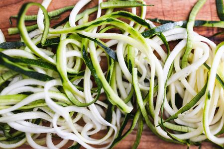 simple food ingredients concept, zucchini noodles on wooden cutting board