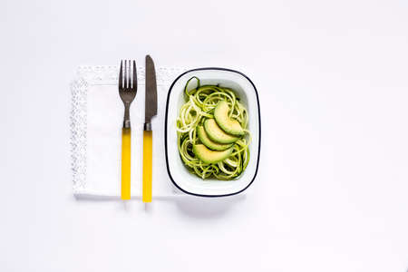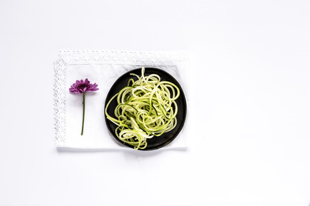 Fresh green raw vegetables and herbs spaghetti zucchini, white radish, green paprika, ice salad for cooking vegan dinner salad. Top view, close up