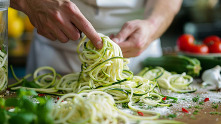 Healthy conscious kitchen with hands preparing zucchini noodles.