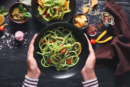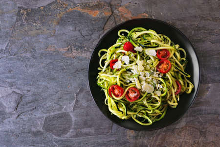 Zucchini pasta topped with tomatoes and basil pesto. Top view on a dark slate background. Healthy eating, low carb diet concept.