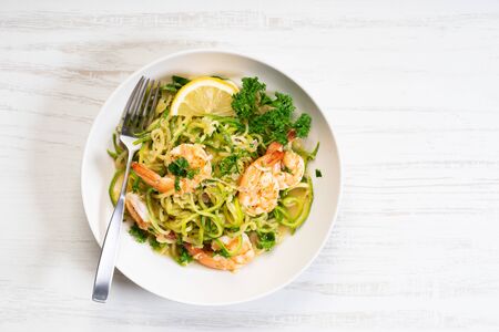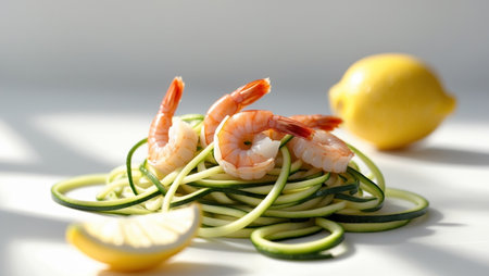 AI Generated. Zucchini noodles arranged with shrimp and lemon