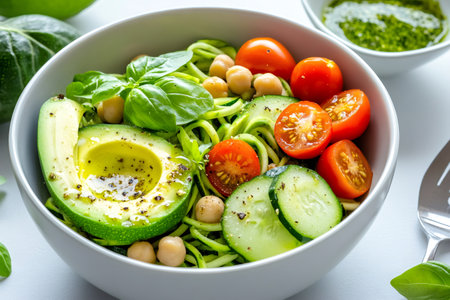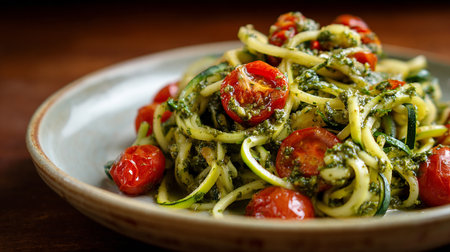 Close-up of a bowl of zucchini noodles tossed in vibrant green pesto and juicy cherry tomatoes. A refreshing and healthy summer meal.