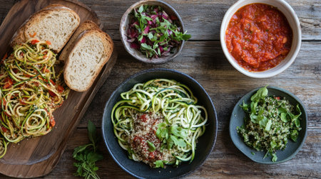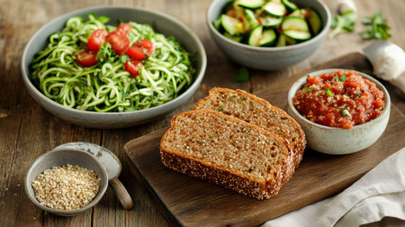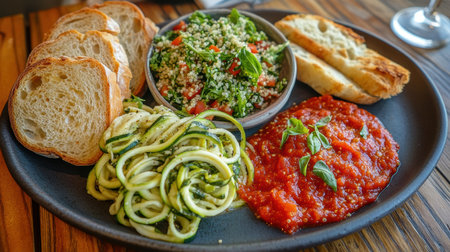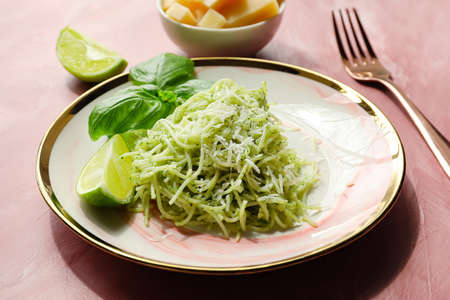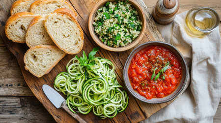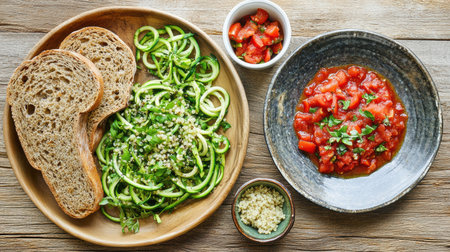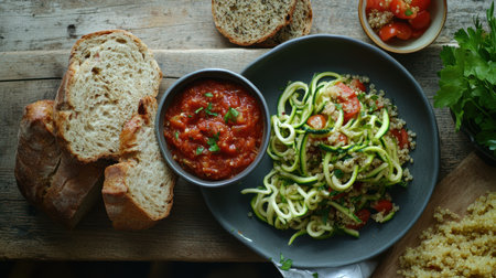 Zucchini spaghetti with pesto sauce and bread on wooden table