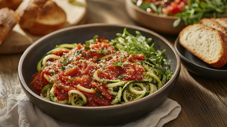 Zucchini spaghetti with tomato sauce and arugula on plate