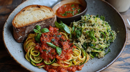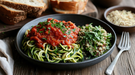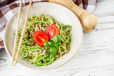 Spaghetti with zucchini, tomatoes and quinoa on wooden table
