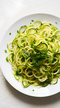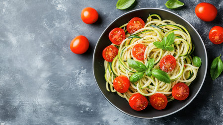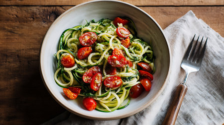 AI Generated. Delicious Zucchini Noodles with Cherry Tomatoes and Basil Healthy Summer Food Dish