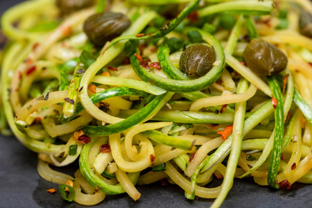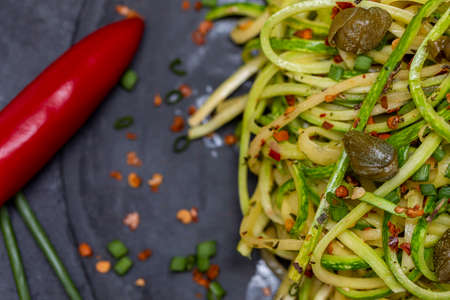Zucchini spaghetti with dehydrated pepperoni pepper and capers.