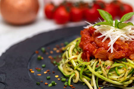 Zucchini spaghetti with dehydrated pepperoni pepper, red sauce and grated Parmesan cheese