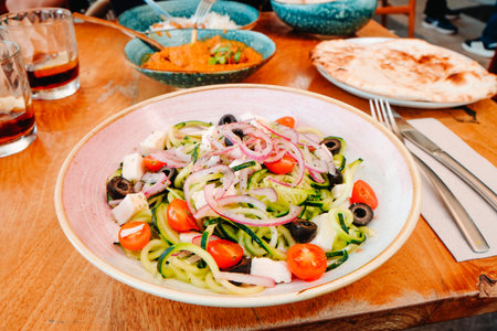 spiralized courgette salad greek style with tomato feta olives cucumber