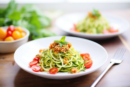 Fresh and healthy zucchini noodle salad with tomatoes and pesto