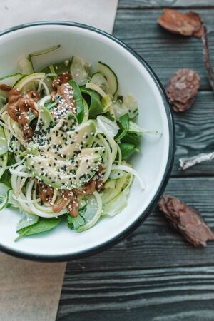Raw vegan zucchini noodles with tofu and tomatoes in a wooden bowl. Healthy raw vegan food concept.