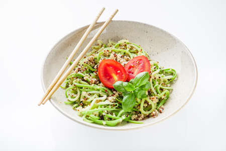 Delicious zucchini spaghetti salad with hempseeds, spinach, pumpkin seeds, decorated with flowers, in bowl, isolated over white background. Food concept. Organic dish