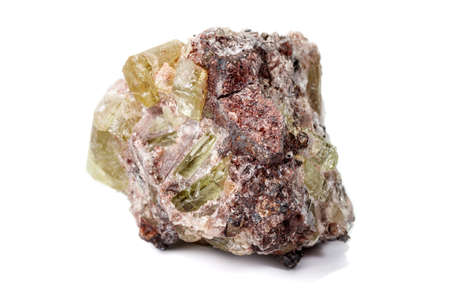 closeup of sample of natural mineral from geological collection - unpolished Apatite rock on white marble background