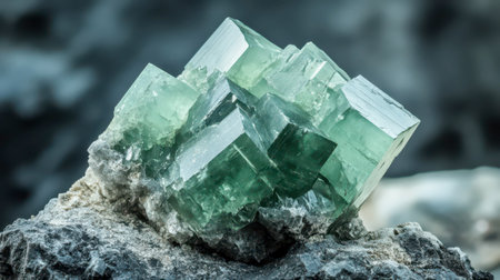 A striking cluster of green fluorite crystals sparkles under natural light, resting on a textured, rocky surface. The vibrant colors and intricate formations highlight natural beauty.