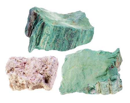 closeup of sample of natural mineral from geological collection - unpolished Talc rock on white marble background