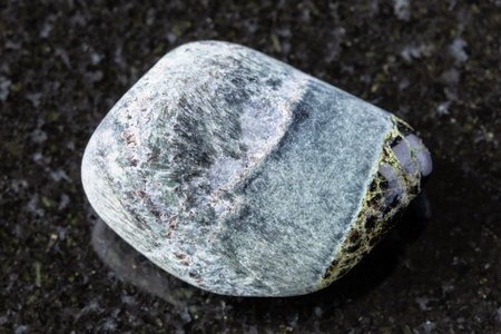 sample of polished actinolite rock on black granite background close up from North Karelia, Russia