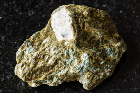 sample of raw rodingite rock on black granite background close up from Kazakhstan