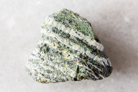 sample of raw chrysotile serpentine mineral on white marble background close up