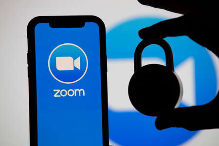 LONDON, UK - April 2nd 2020: Zoom video conference app icon on a mobile device with silhouette of a padlock
