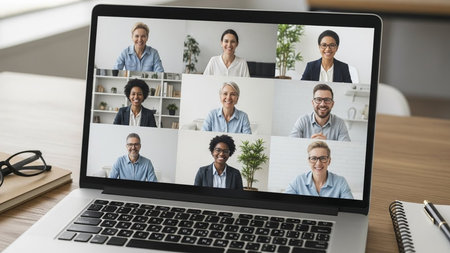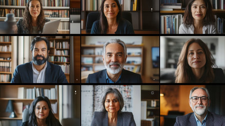 Diverse group of professionals in virtual meeting with multinational team on video conference. That the image is generated using AI.