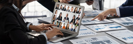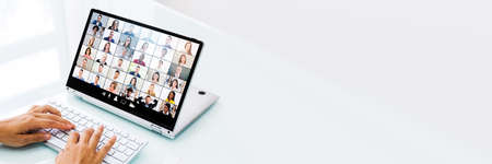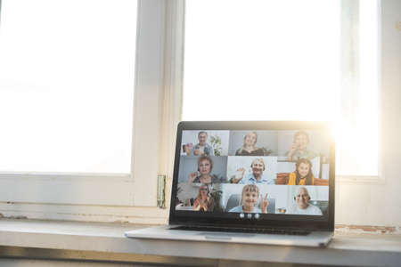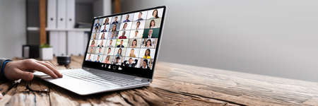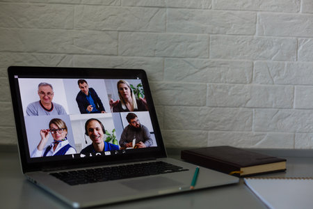 Virtual meeting online. Distant business meeting, on the laptop screen, people gathered in a video conference to work online, discuss ideas, planning strategy via video call. Copy space, mock-up