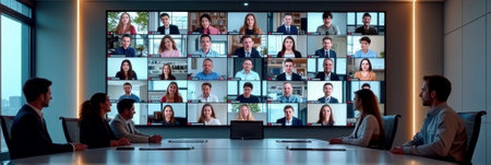 A video conference shows a diverse group of professionals sharing ideas and collaborating from their respective office spaces.
