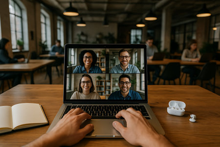 First-person view of hands on a laptop displaying a video conference with four diverse, smiling professionals. The scene captures a modern office or coworking space in the blurred background, along with a notebook and wireless earbuds on a wooden desk, emphasizing contemporary digital collaboration and remote work.