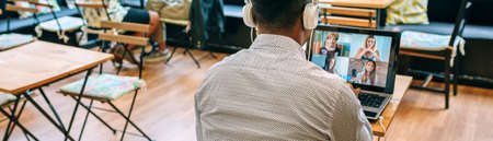 Unrecognizable man talking on videoconference with friends from a coffee shop