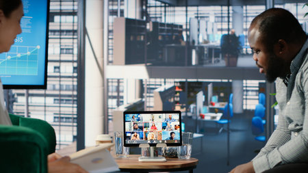 Multiethnic group of business leaders meeting with investors on video call online, working together and brainstorming ideas for a new investment strategy. Success story. Camera B.