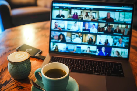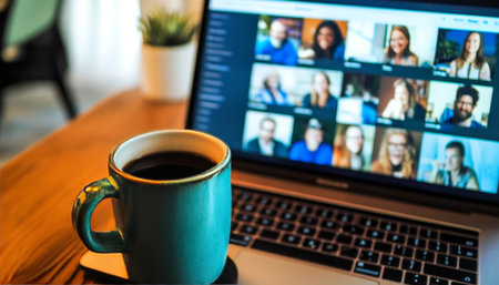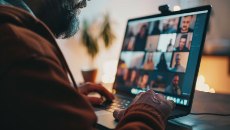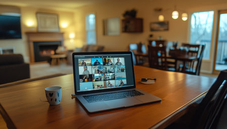 Young male is engaged in a virtual meeting on a laptop, showcasing a group video call with a warm, inviting workspace in the background.