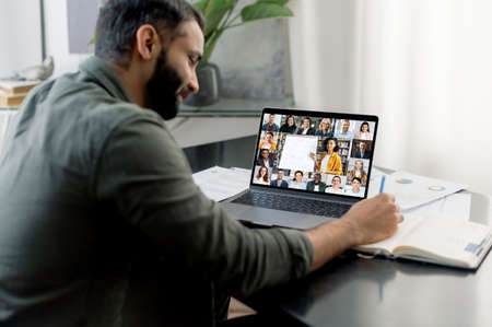 Online training, webinar. Over shoulder view of a successful smart guy listening to an online lecture, taking notes in a notebook, on a laptop screen, a teacher and a group of multiracial people