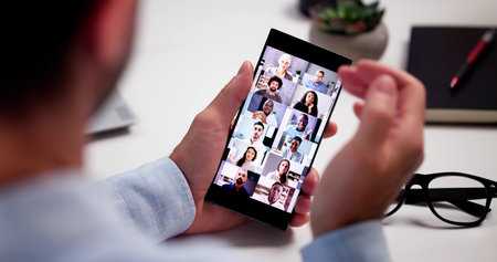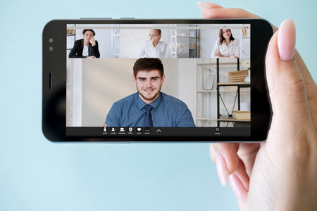 Mobile conference. Video call. Internet communication. Diverse business team listening boring presentation online on phone screen in hand on blue.