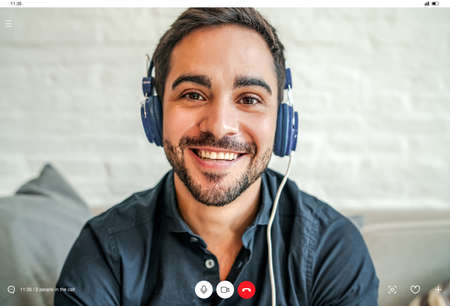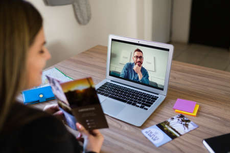Happy young man buying a vacation trip from a travel agent during a teleconference