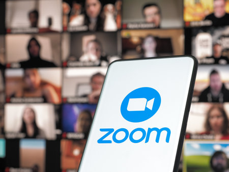 Zoom video conference app logo on the smartphone screen. High quality photo