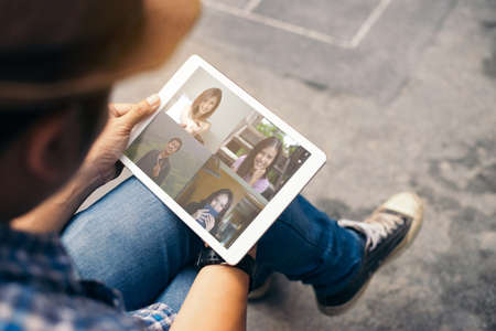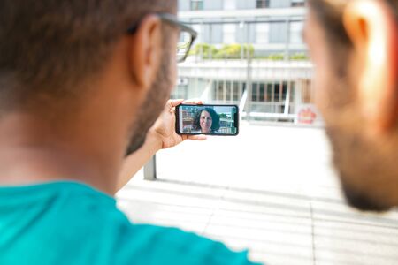 Woman talking to her male friends or colleague through video call on cell. Rear view of young men sitting outside, holding smartphone with speaking woman on screen. Conference call concept