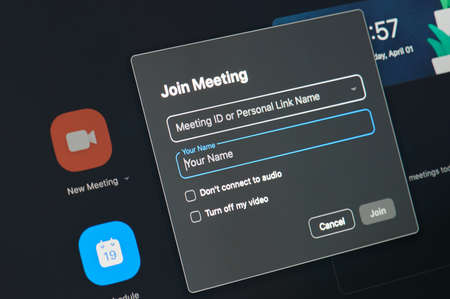 New-York , USA - April 1, 2020: Join meeting in zoom app on laptop screen close up view