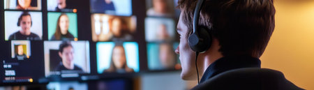 A remote worker engaged in a virtual meeting, focused on multiple screens displaying diverse participants in a professional setting.