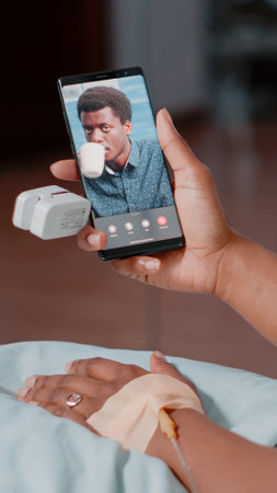 African american woman using smartphone with video call to talk to man while sitting in hospital ward. Young patient with IV drip bag talking to adult on online video conference.