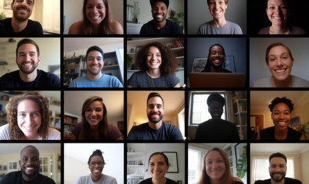 Composite image of coworkers smiling and communicating together while having video call : Generative AI