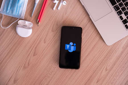 BANGKOK, THAILAND - MAY 17, 2020: A user opens the Microsoft Teams application on smartphone screen on the wooden desk. Microsoft Teams is a popular application suitable for working from home.