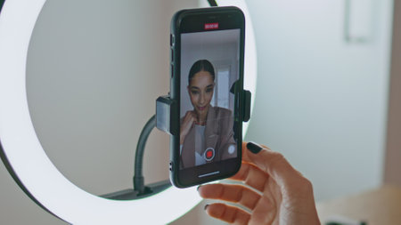 Beauty blogger started recording video mobile phone view at apartment. Closeup woman greeting subscribers talking to cellphone camera. Happy influencer girl creating content broadcasting live stream
